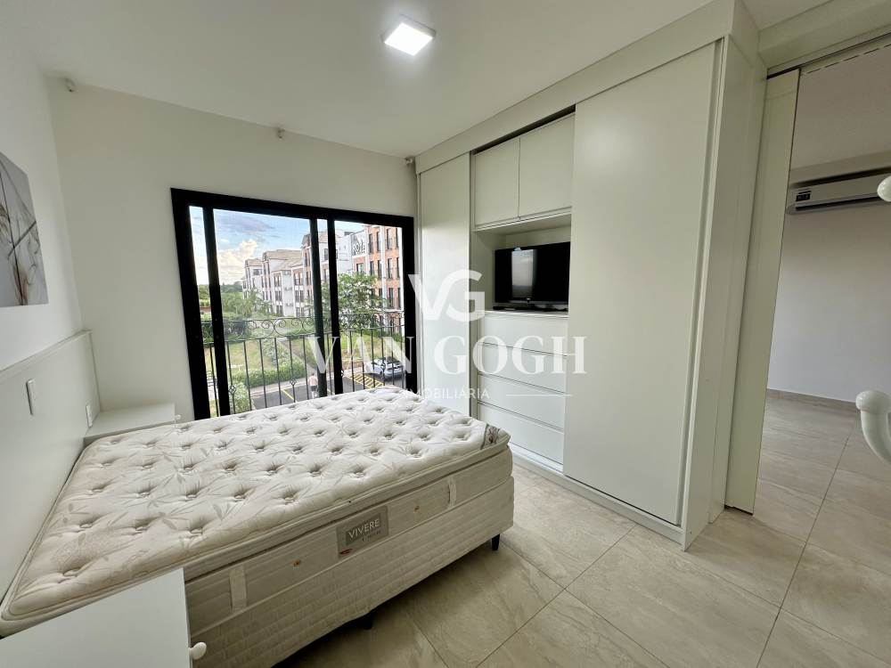 Está equipado com cama, TV e ar-condicionado, além de uma cozinha funcional com cooktop, exaustor e geladeira duplex, o imóvel conta ainda com armários planejados em todos os espaços, garantindo organização e praticidade.