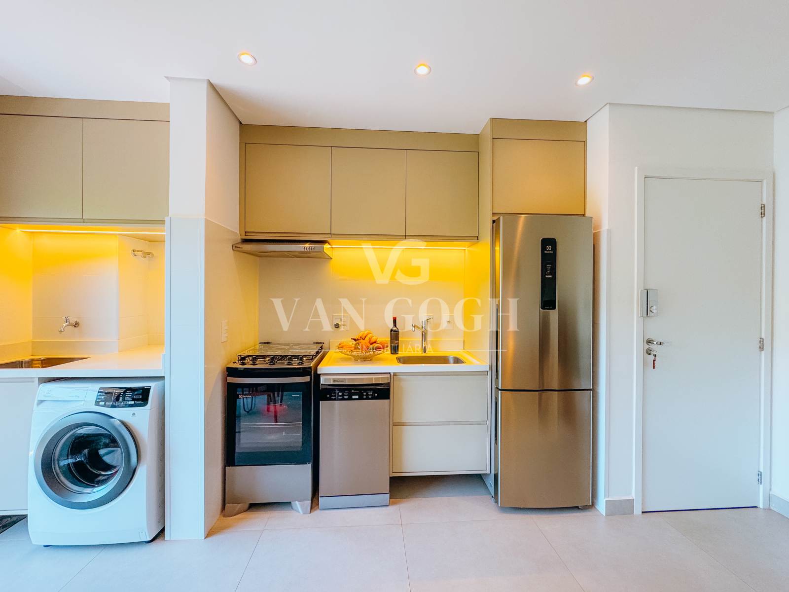 A área social é acolhedora e já está totalmente mobiliada, incluindo sofá, rack, televisão, tapete, mesa de centro, mesa de jantar com cadeiras e aparador. A cozinha e a lavanderia possuem armários planejados e estão equipadas com geladeira, fogão, depurador, cafeteira e máquina de lavar-roupas. O aquecimento de água central com torneiras monocomando garante ainda mais praticidade.