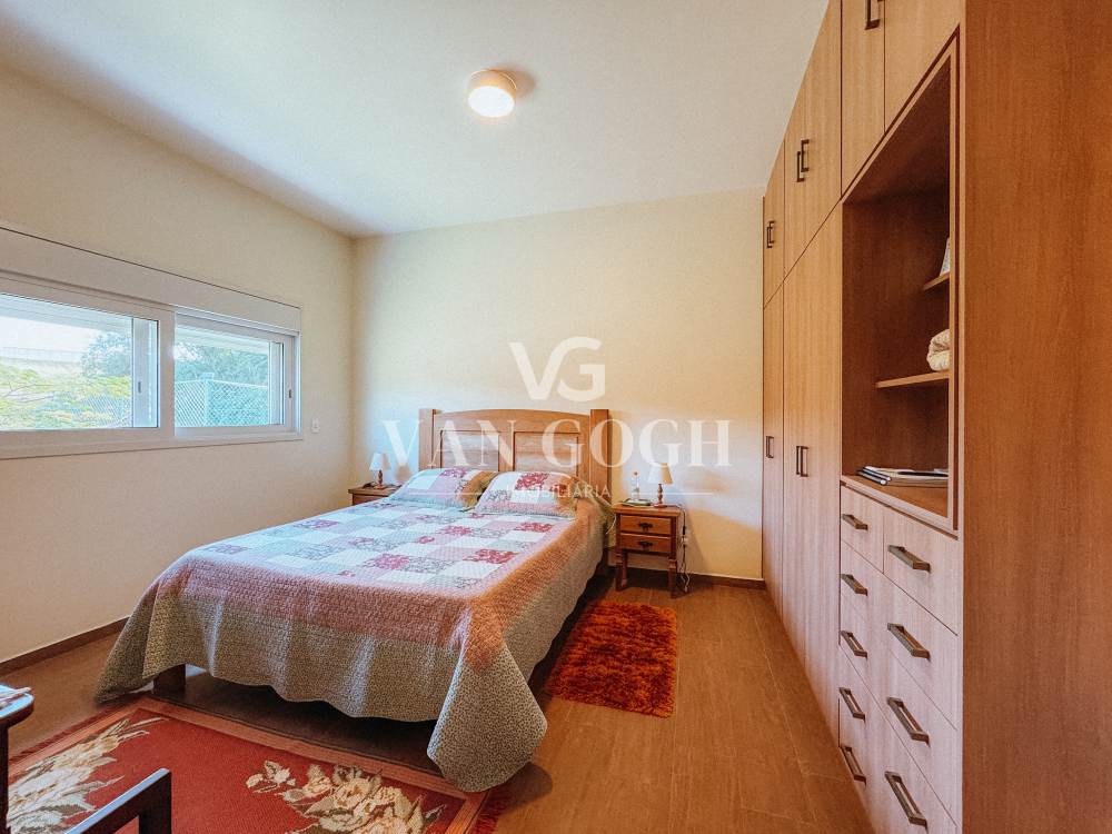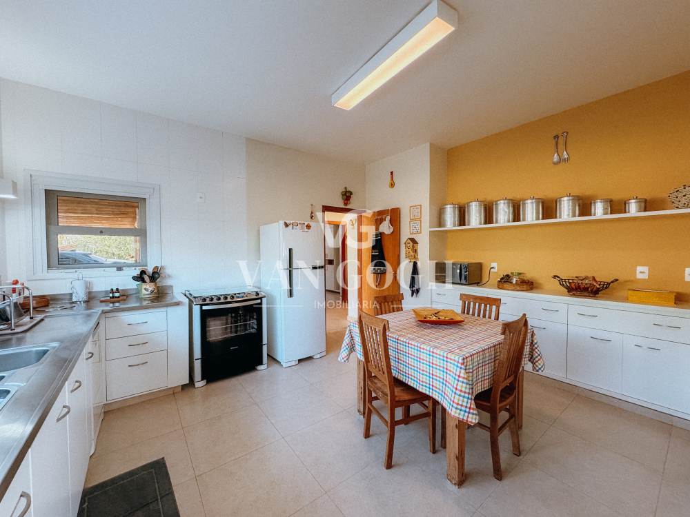 A casa é térrea e apresenta um projeto funcional e elegante, com ambientes amplos, pé-direito alto e acabamentos de excelente qualidade. A área social conta com uma sala para dois ambientes, lareira imponente e integração com a área externa. A cozinha é planejada e bem equipada, enquanto a sala de jantar conta com um amplo louceiro, garantindo charme, praticidade e organização ao ambiente.