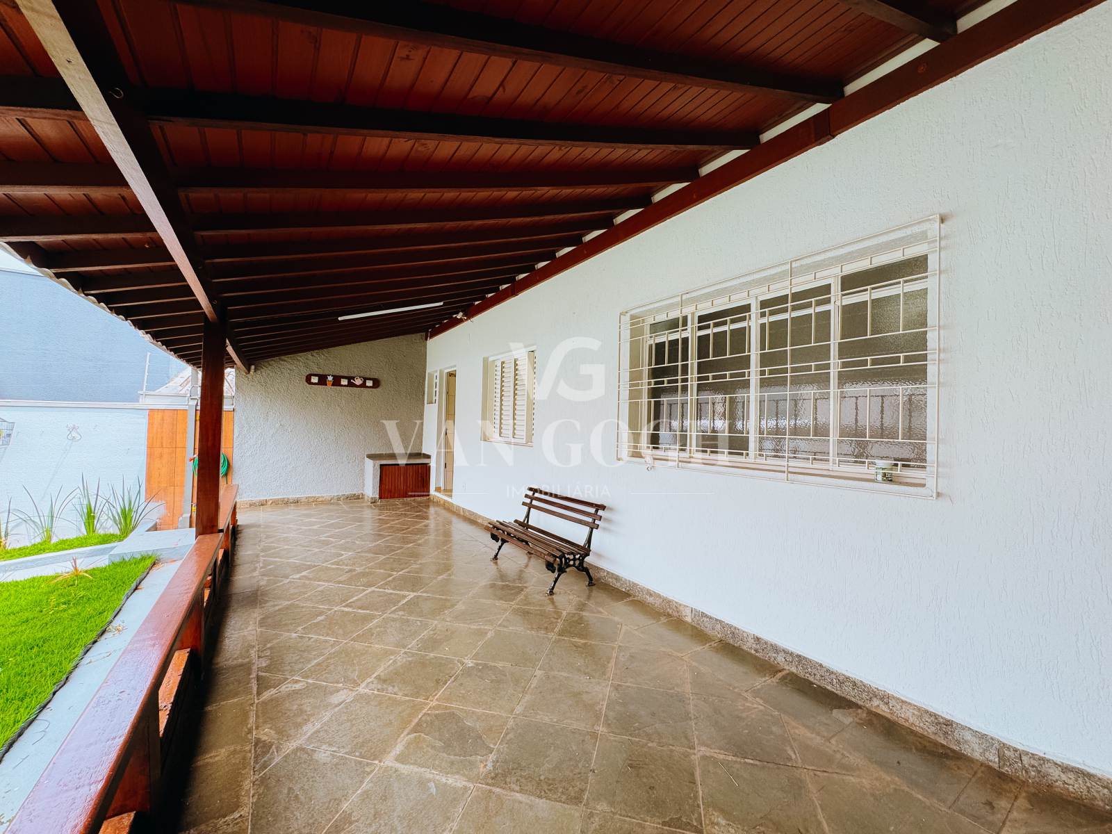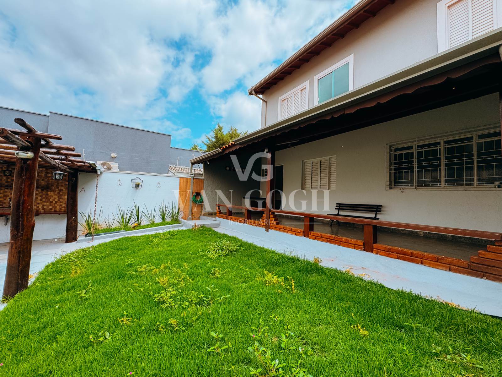A área externa é um dos grandes destaques: a varanda que contorna toda a casa cria espaços acolhedores para relaxar, e a área gourmet coberta, equipada com churrasqueira, é ideal para receber amigos e familiares.